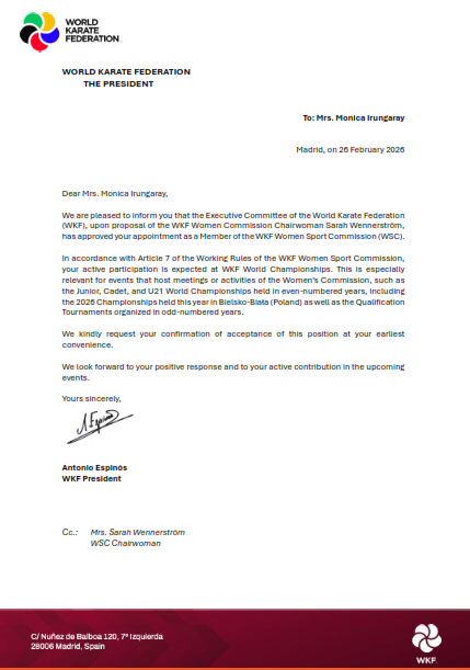 Nos complace informarle que el Comité Ejecutivo de la Federación Mundial de Karate (WKF), a propuesta de la Presidenta de la Comisión de Mujeres de la WKF, Sarah Wennerström, ha aprobado su nombramiento como miembro de la Comisión de Deporte Femenino de la WKF (WSC).
